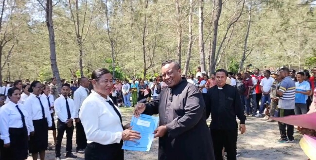 TIMORMEDIA.COM – Suasana penyerahan SK Pegawai Pemerintah dengan Perjanjian Kerja (PPPK) Kabupaten Malaka tahun 2025 di Pantai Cemara Abudenok, Desa Umatoos, Kecamatan Malaka Barat, Kamis (23/10/2025), diwarnai pesan reflektif dari Pastor Paroki Besikama, Romo Oktovianus Neno, Pr.